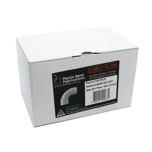 The 25mm Conduit Elbow Grey is a durable and reliable fitting designed to ensure smooth and secure turns in your conduit system. Ideal for both residential and commercial applications, this elbow helps maintain the integrity of your wiring and electrical installations. Available in a pack of 20, it is perfect for large projects and is proudly Australian made for long-lasting performance and quality.