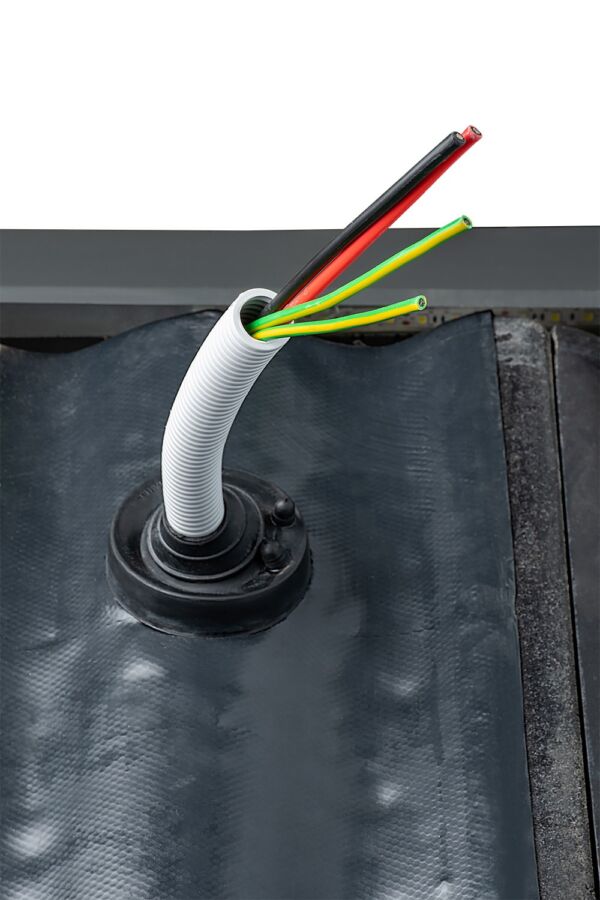 Our Flexatile has a base size of 280mm x 450mm and displays a rubber cone in the center to securely hold the electrical conduit in place. The rubber cone can suit a pipe size range from 5mm to 150mm (depending on where you cut the cone down)
